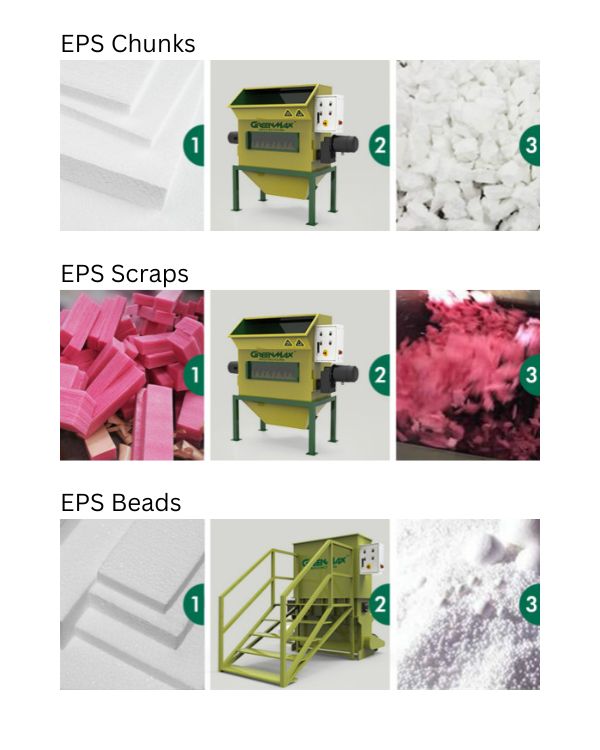 The EPS Foam Crusher is large-scale equipment specifically for recycling EPS beads. The ultimate recycling purpose of the EPS recycling system is to first break waste EPS into EPS beads, which are the “monomers” that make up EPS